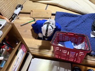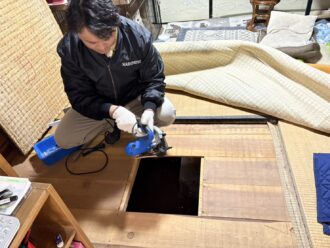 今回のお住まいには床下点検口がなかったため、和室の畳から入らせていただいています。