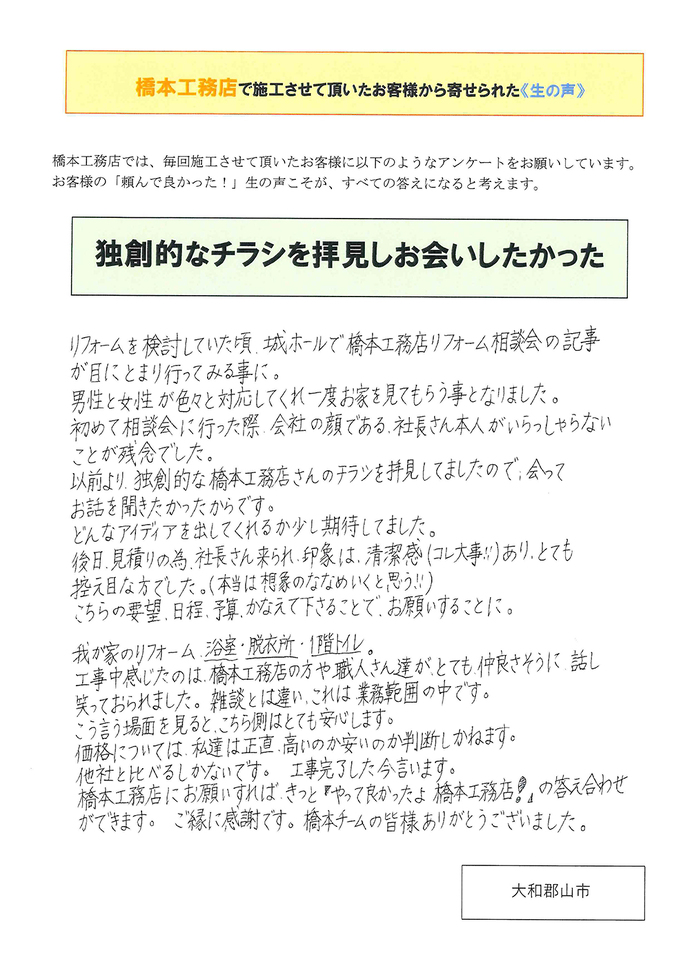 以前より、独創的な橋下工務店さんのチラシを拝見してましたので、会ってお話を聞きたかったからです。
