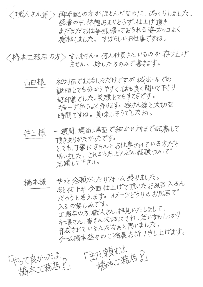工務店の方、職人さん、拝見いたしまして社長さん、皆さん大切にされ、若い方もしっかり育成されているんだなぁと思いました。チーム橋本益々のご発展をお祈り申し上げます。