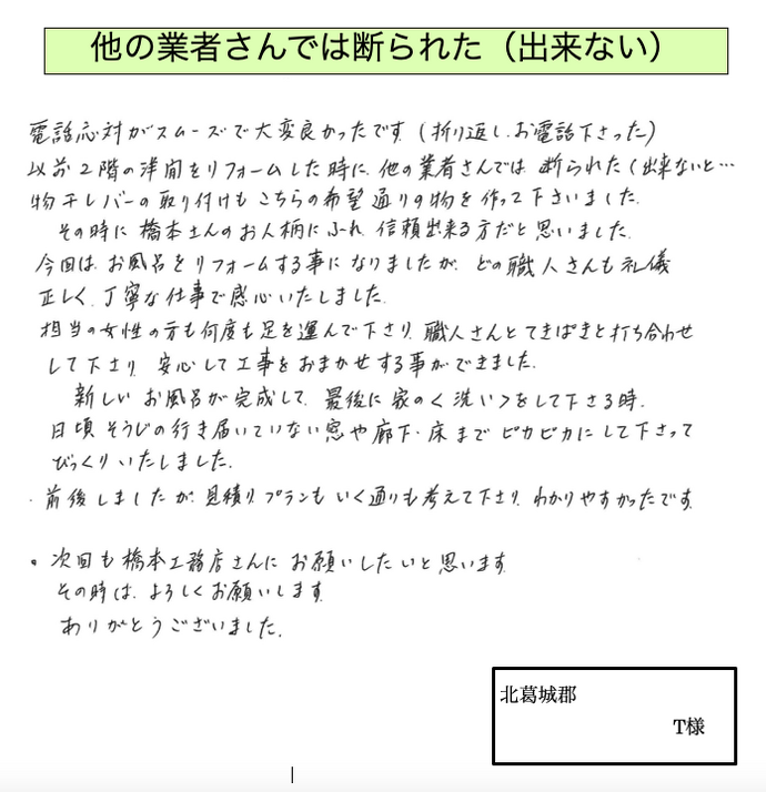その時に橋本さんのお人柄にふれ、信頼できる方だと思いました。今回はお風呂をリフォームする事になりましたふぁ、どの職人産も礼儀正しく、丁寧な仕事で感心いたしました。